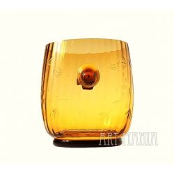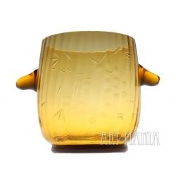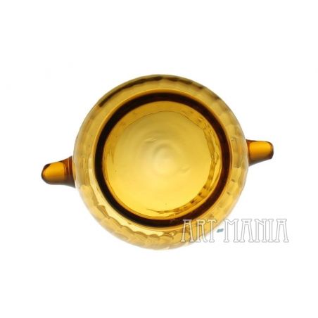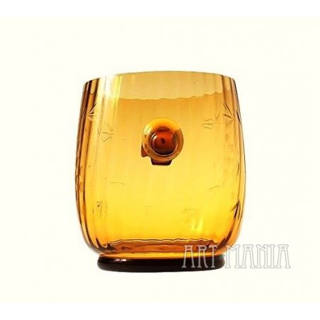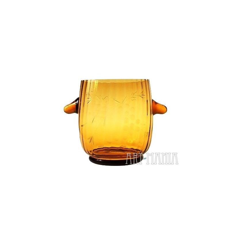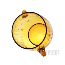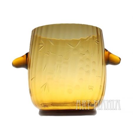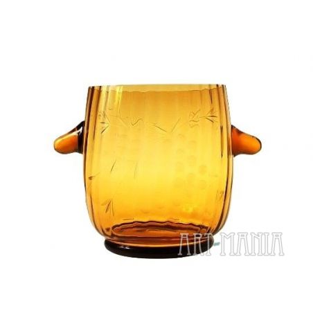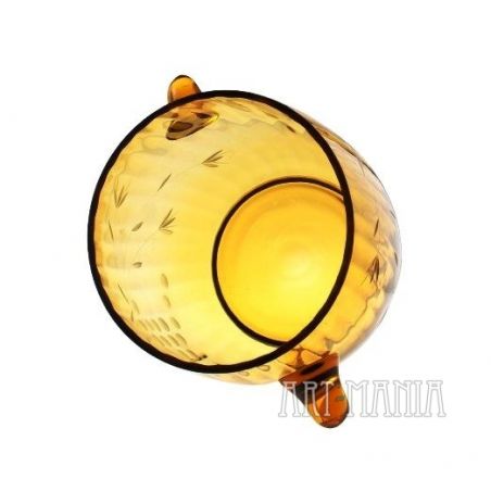 Bola do ponczu/pojemnik na lód wykonany z miodowego szkła sodowego. Czara zdobiona szlifowanym motywem roślinnym. Pochodzi z jednej z polskich hut szkła - przypuszczalnie z Huty Laura w Tarnowie. Lata 80XXw.