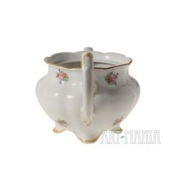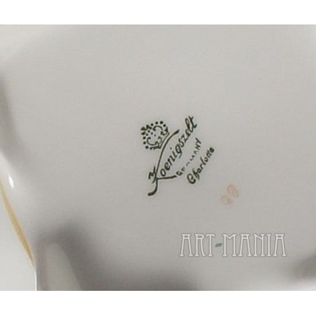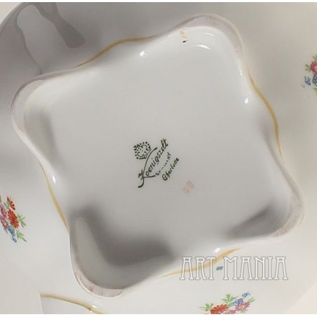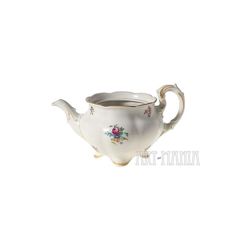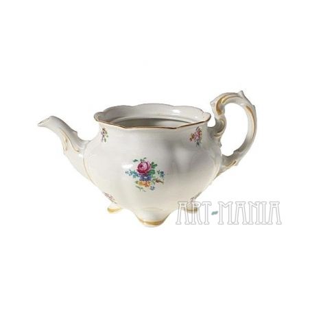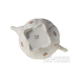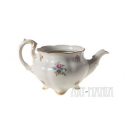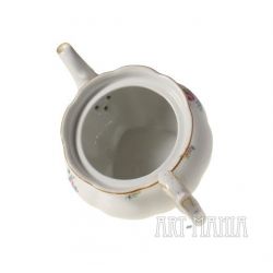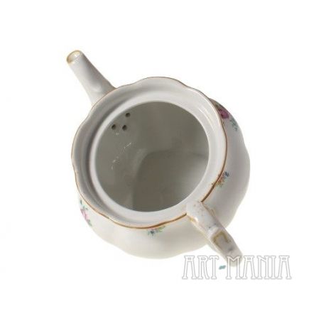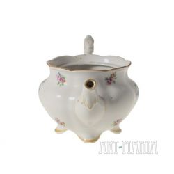 Dzbanek do herbaty z białej porcelany - element serwisu Charlotte. Brzusiec pokryty kwiatową kalkomanią. Krawędzie i detale naczynia zdobione ugrowymi kreskami. Naczynie utrzymane w stylistyce nawiązującej do epoki rokoko pochodzi z niemieckiej wytwórni Porzellanfabrik Koenigszelt A.G. w Jaworzynie Śląskiej. Sygnatura wskazuje na lata 1930-1945.