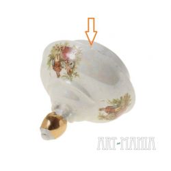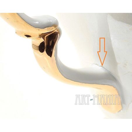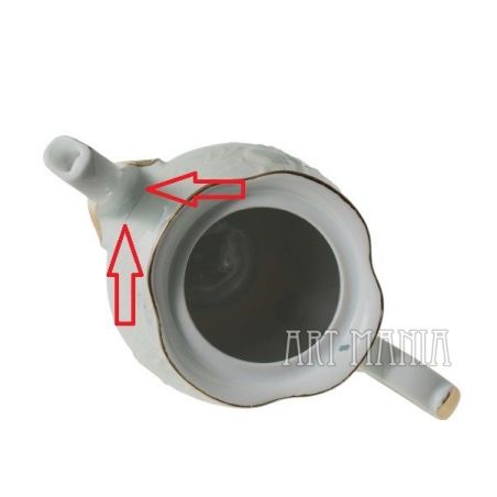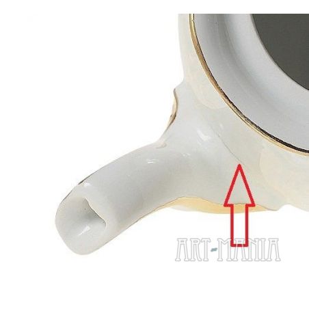 Na krawędzi pokrywki ubytek szkliwa ok. 2mm. Jedna ze scenek rodzajowych na pokrywce jest mniej wyraźna od pozostałych. Powierzchniowe, powstałe podczas wypalania naczynia, spękania masy porcelanowej na łączeniu z brzuścem: przy dolnym mocowaniu ucha (ok. 2,5cm) i wylewu (ok. 2cm). Spękania nie mają wpływu na walory użytkowe naczynia.