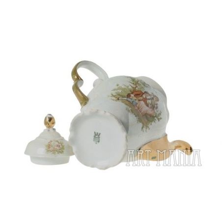 Barokowy wyzłacany dzbanek z porcelany – element serwisu do herbaty „Fryderyka”. Naczynie zdobi perłowa, opalizująca powłoka i scenki rodzajowe. Dzbanek pochodzi z Zakładu Porcelany Stołowej „Krzysztof” w Wałbrzychu. Lata 60XXw.