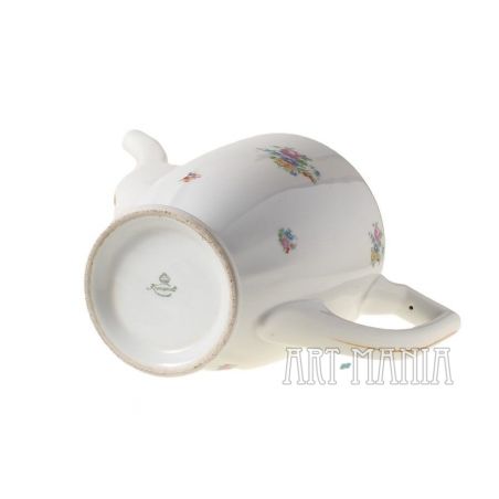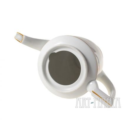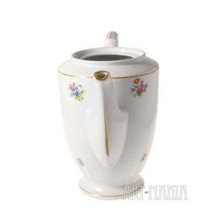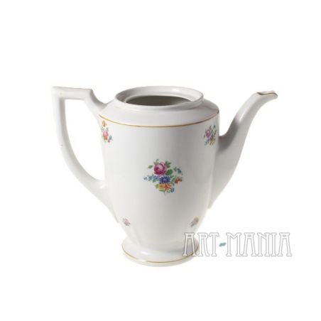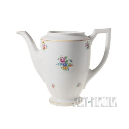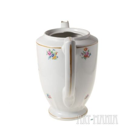 Dzbanek do kawy z białej porcelany. Brzusiec pokryty kwiatową kalkomanią. Krawędzie i detale naczynia zdobione ugrowymi kreskami. Naczynie utrzymane w stylistyce nawiązującej do epoki art deco pochodzi z niemieckiej wytwórni Porzellanfabrik Koenigszelt A.G. w Jaworzynie Śląskiej. Sygnatura wskazuje na lata 1930-1945.