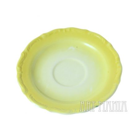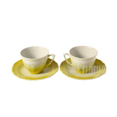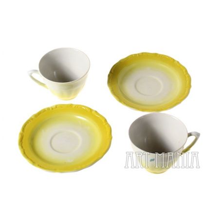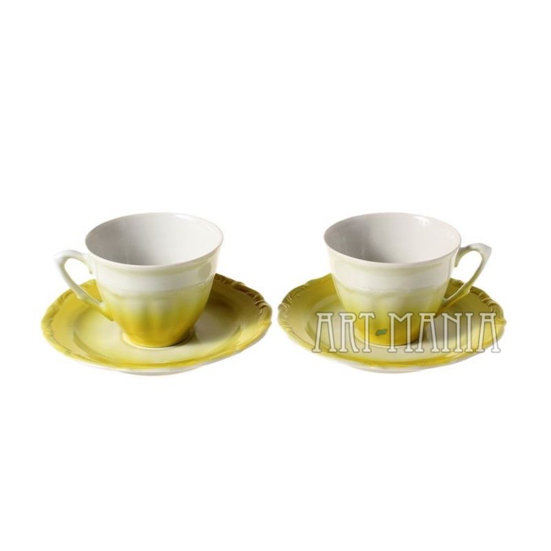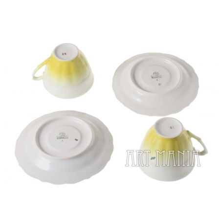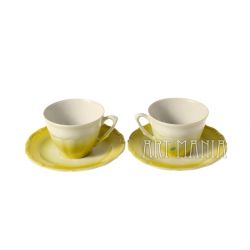 Para filiżanek i spodków z porcelany - elementy serwisu do kawy Maria Teresa. Malowane na kolor cytrynowy. Pochodzą z Zakładu Porcelany Stołowej „Wałbrzych” w Wałbrzychu. Lata 60/70 XX w.