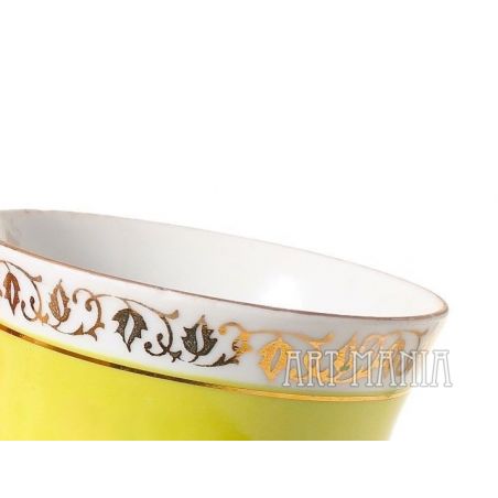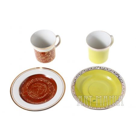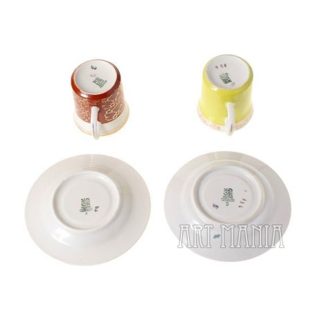 Para filiżanek i spodków z porcelany - elementy serwisu do mokki. Brązowa i limonkowa z wyzłacanymi detalami. Pochodzą z Zakładów Fajansu „Włocławek” we Włocławku. Lata 70XXw.