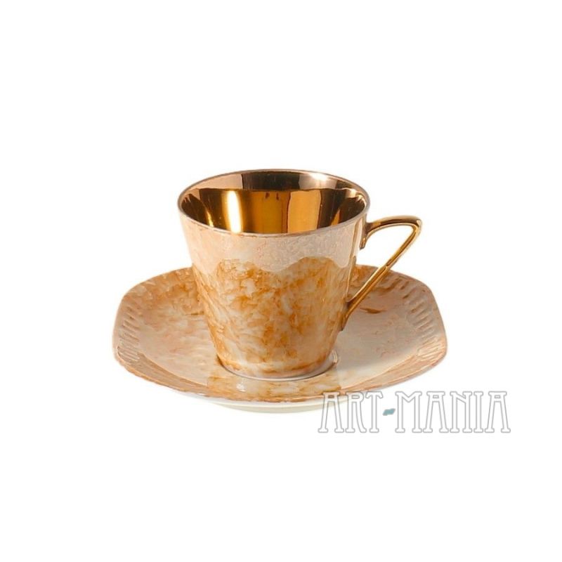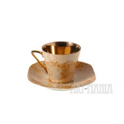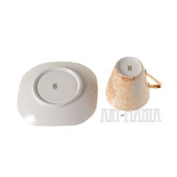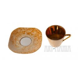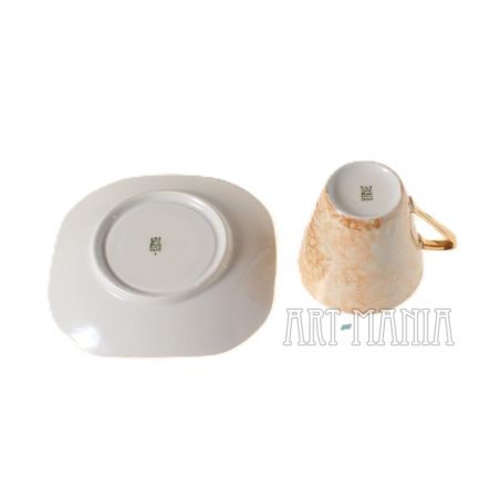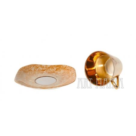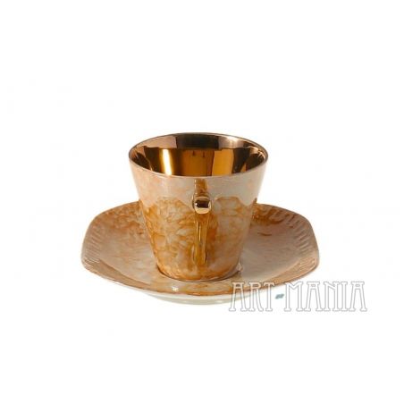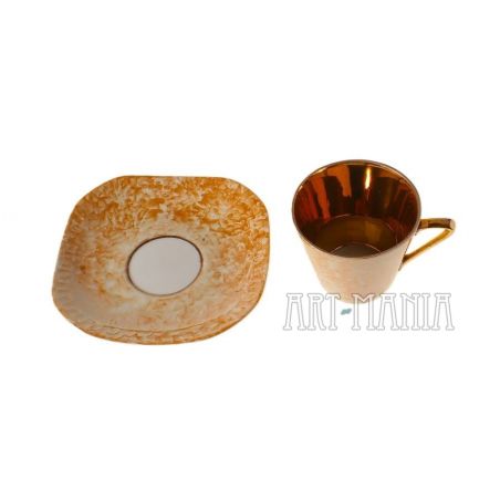 Wyzłacana filiżanka i spodek z porcelany – elementy serwisu do kawy „Helena”/”Millenium”. Elementy zestawu zdobi jasnopomarańczowa, melanżowa malatura i wyraziste złocenia. Serwis to projekt wspólny Edmunda Ruszczyńskiego i Jana Kwinty. Pochodzi z Zakładu Porcelany Stołowej „Krzysztof” w Wałbrzychu. Lata 60/70XXw.