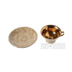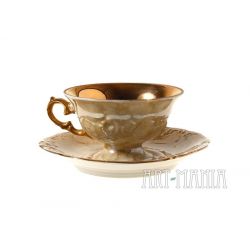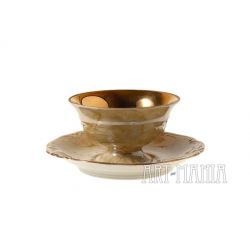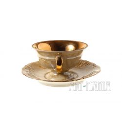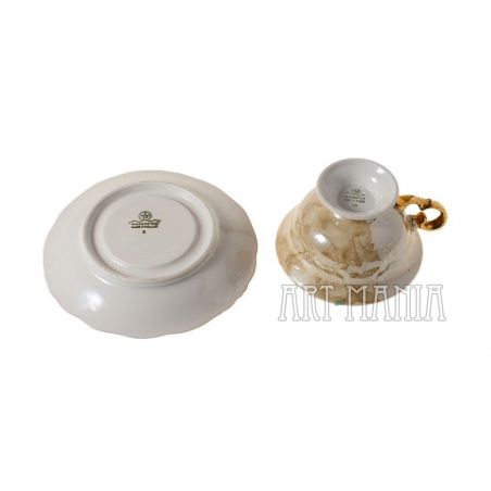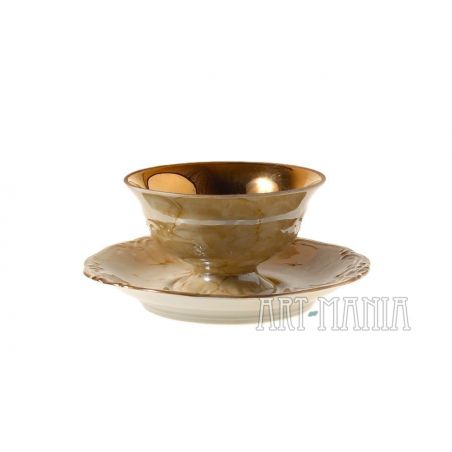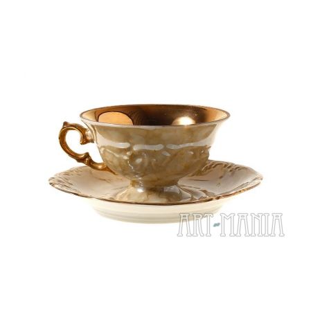Barokowa wyzłacana filiżanka i spodek z porcelany – elementy serwisu do herbaty „Fryderyka”. Naczynia zdobi beżowa, melanżowa malatura. Zestaw pochodzi z Zakładu Porcelany Stołowej „Wałbrzych” w Wałbrzychu. Lata 60XXw.