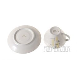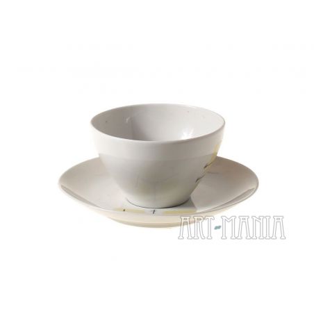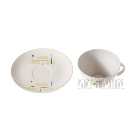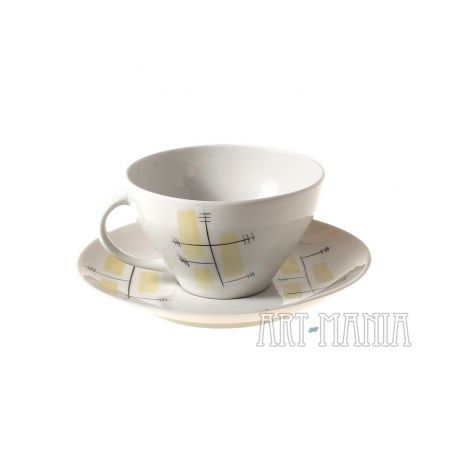 Filiżanka i spodek z porcelany - elementy serwisu do kawy/herbaty „Joanna” zaprojektowanego przez Wincentego Potackiego. Zestaw pochodzi z Zakładów Porcelany Stołowej „Karolina” w Jaworzynie Śląskiej. Stylistyka new look. Lata 60XXw.