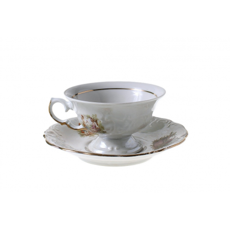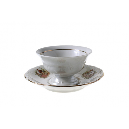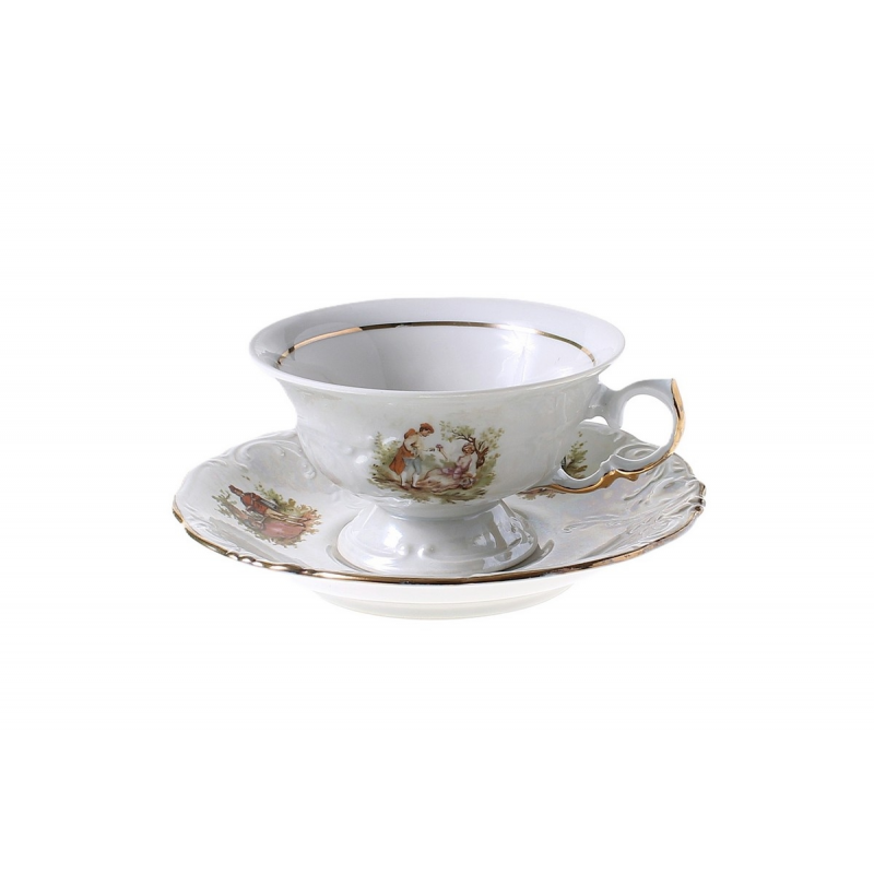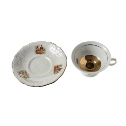 Barokowa wyzłacana filiżanka i spodek z porcelany – elementy serwisu do herbaty „Fryderyka”. Naczynia zdobi perłowa, opalizująca powłoka i scenki rodzajowe. Zestaw pochodzi z Zakładu Porcelany Stołowej „Wałbrzych” w Wałbrzychu. Lata 60XXw.