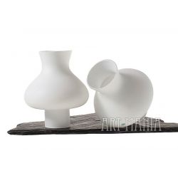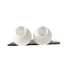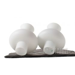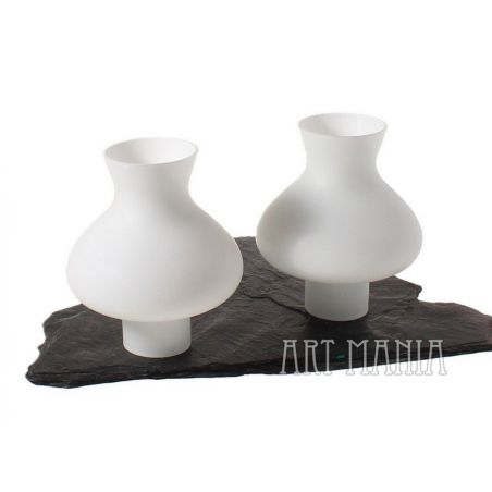 Dwa białe klosze uformowane na kształt cylindra lampy naftowej. Wykonane ze szkła warstwowego. Oryginalnie stanowiły elementy drewnianego żyrandola z lat 80-tych.