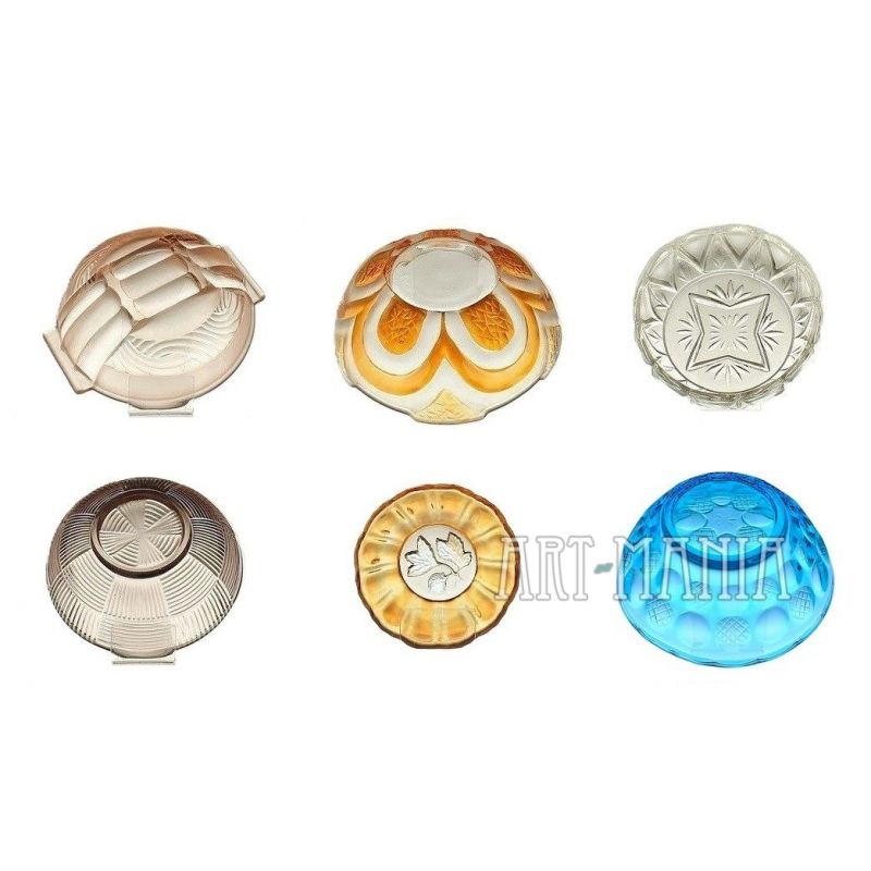 Sześć salaterek wykonanych z kolorowego szkła prasowanego. Salaterki pochodzą z Huty Szkła Gospodarczego „Hortensja” w Piotrkowie Trybunalskim (modele nr: 36a (element garnituru do konfitur), 146, 438, i 460) oraz z Huty Szkła Gospodarczego „Ząbkowice” w Dąbrowie Górniczej (błękitna i ametystowa).