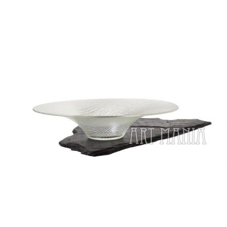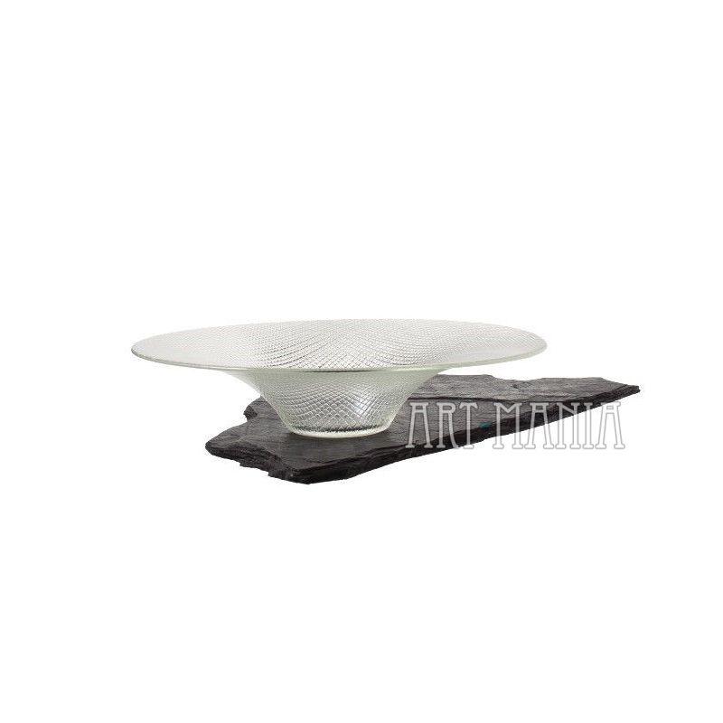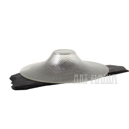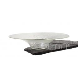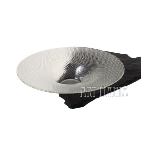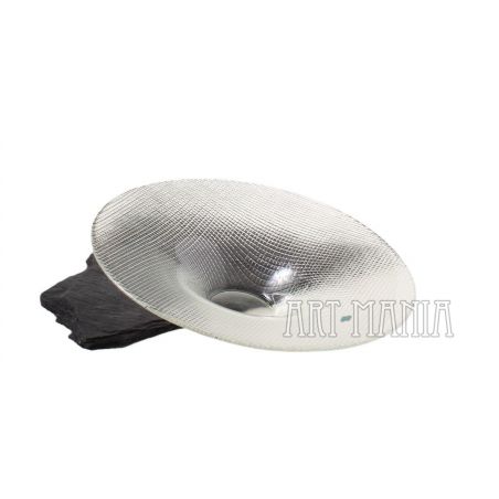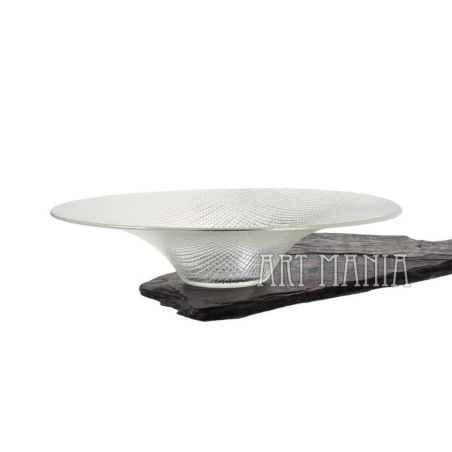 Cienkościenna misa wykonana z bezbarwnego szkła prasowanego. Zdobiona tłoczonym motywem kratki. Stylistyka op-art.