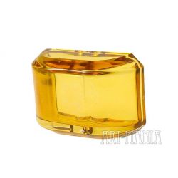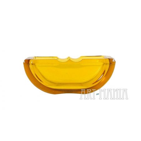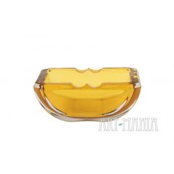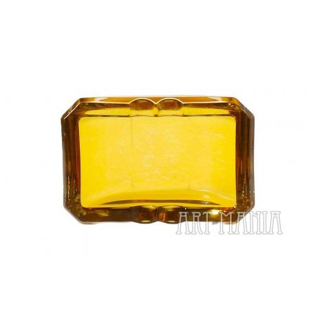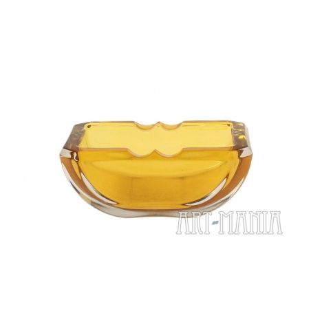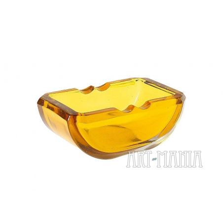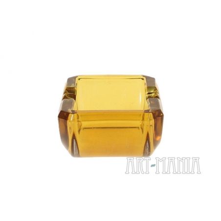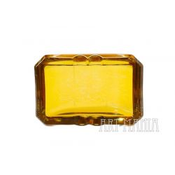 Grubościenna popielnica na cztery papierosy wykonana ze szkła prasowanego. Bezbarwna z miodową powłoką wewnątrz (przypuszczalnie lazurowaną). Forma naczynia idealnie wpisuje się w stylistykę art deco. Pochodzenie nieznane. II poł. XXw.