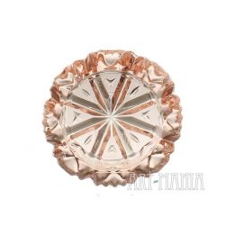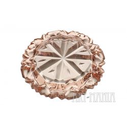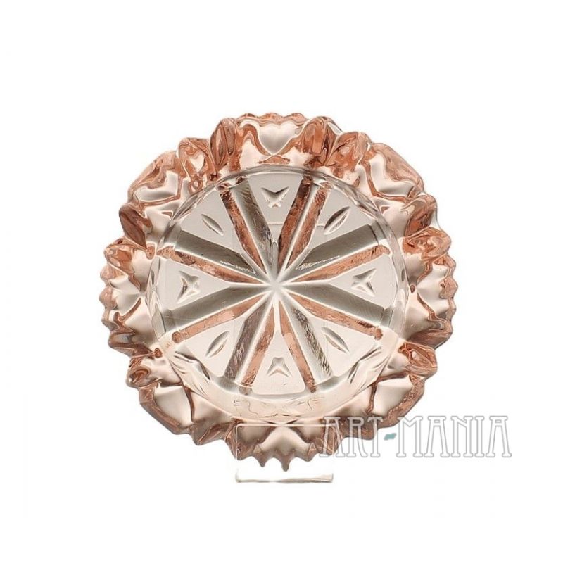 Popielnica wykonana ze szkła prasowanego barwionego w masie na kolor jasnoróżowy. Zdobiona tłoczeniem, które przywodzi na myśl gwiazdkę śniegu. Naczynie pochodzi z Huty Szkła Gospodarczego „Ząbkowice” w Dąbrowie Górniczej. Numer katalogowy: 123. Lata 70XXw.