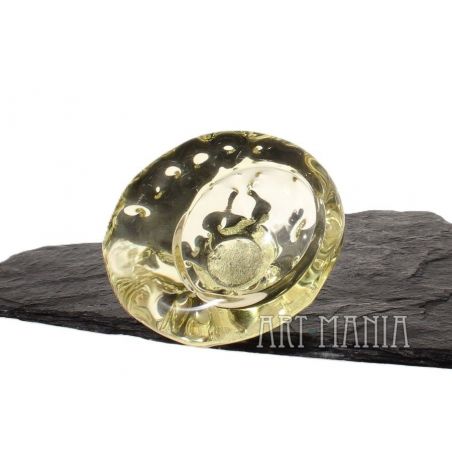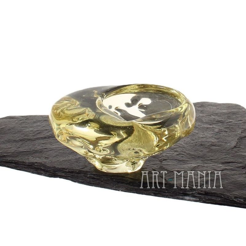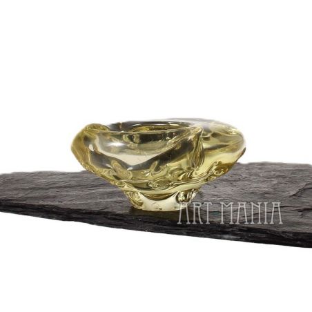 Popielnica na jeden papieros wykonana ze szkła ręcznie formowanego barwionego w masie na kolor cytrynowy. Czarka zdobiona od zewnątrz wypustkami w kształcie „szczypnięć” szkła. Jest to jeden z projektów Miroslava Klingera. Popielnica pochodzi z wytwórni Zelezny Brod w Czechosłowacji. Lata 60XXw.