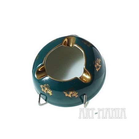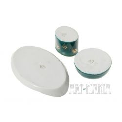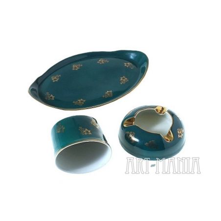 Zestaw do palenia. Wykonany z białej porcelany, zdobiony malaturą w kolorze chłodnej zieleni, wyzłacany. W skład zestawu wchodzą: tacka, pojemnik na papierosy i popielnica. Zestaw pochodzi Zakładów Porcelany Stołowej „Ćmielów” w Ćmielowie. Lata 60XXw.