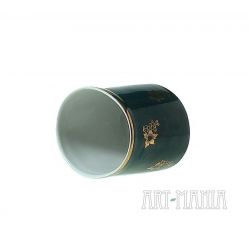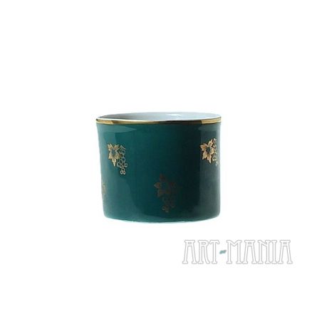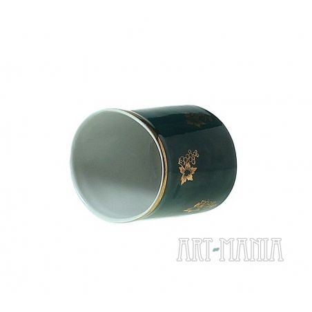 Nieznaczne przetarcia złoceń na popielnicy w kącikach jednego z otworów na papierosy. Wnętrze popielnicy i pojemnika na papierosy czyste, bez osadu i przebarwień. Punktowe przetarcia zielonej malatury na tacce. Brak pęknięć i odprysków.