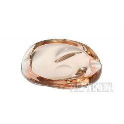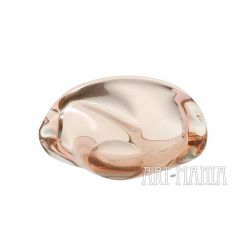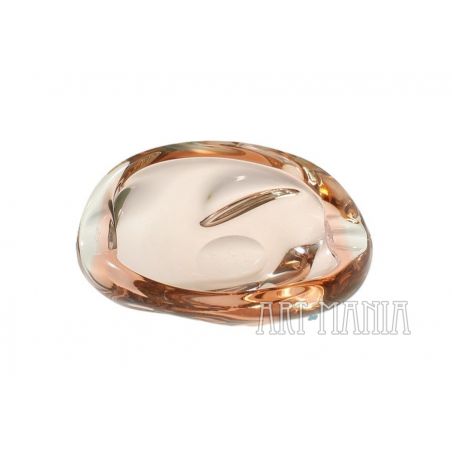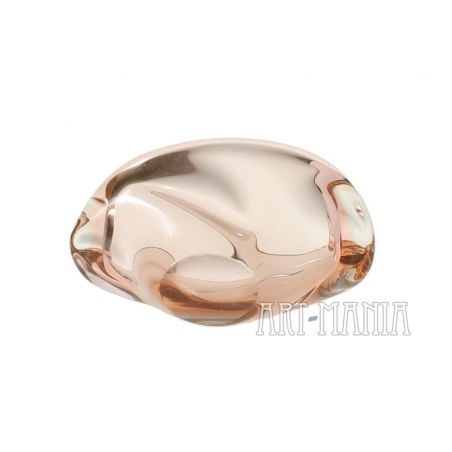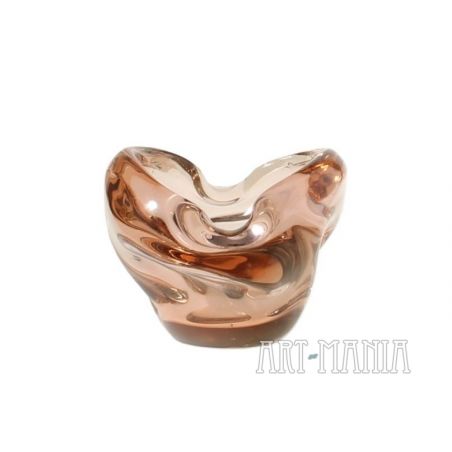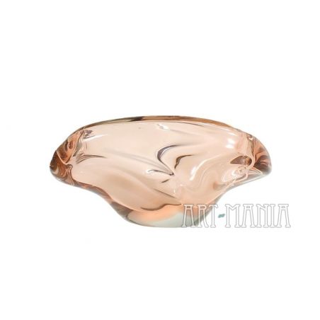 Popielnica wykonana ze szkła ręcznie formowanego, dwuwarstwowego od wewnątrz barwionego w masie na kolor łososiowy. Pochodzi z huty szkła Skrdlovice w Czechosłowacji. Lata 50XXw.