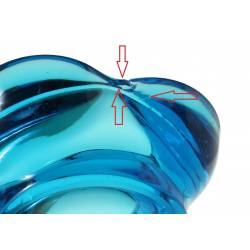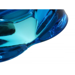 Wnętrze bez osadu i przebarwień. Nieliczne rysy użytkowe. Na krawędzi podstawy mikroubytek ok. 3mm. W zagłębieniu wypustek przy zewnętrznej krawędzi czarki płaski odprysk ok. 1,5cm/ok. 1cm. W świetle dziennym masa szklana jest błękitna – na zdjęciach ma odcień morski.