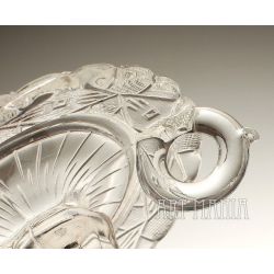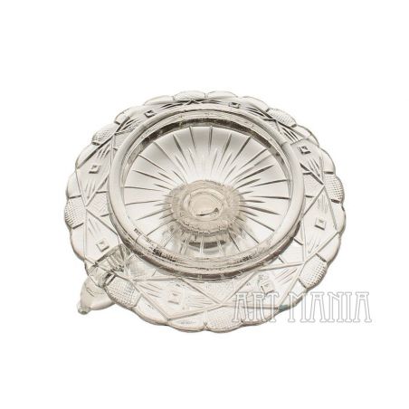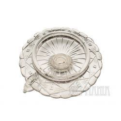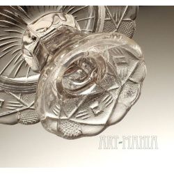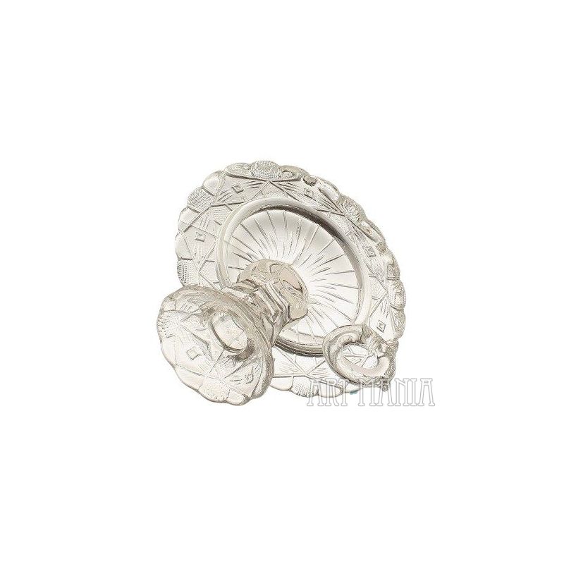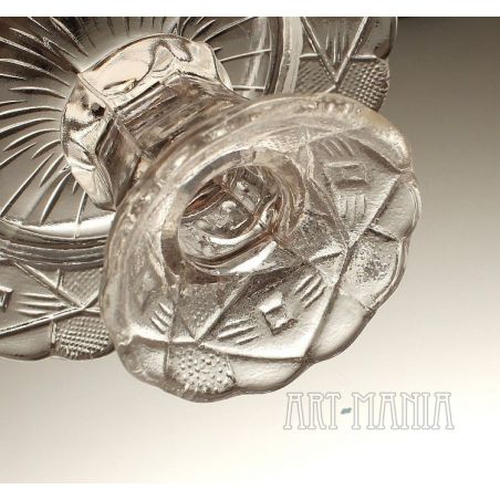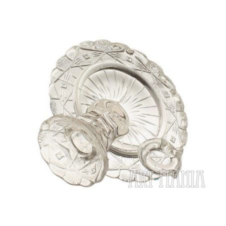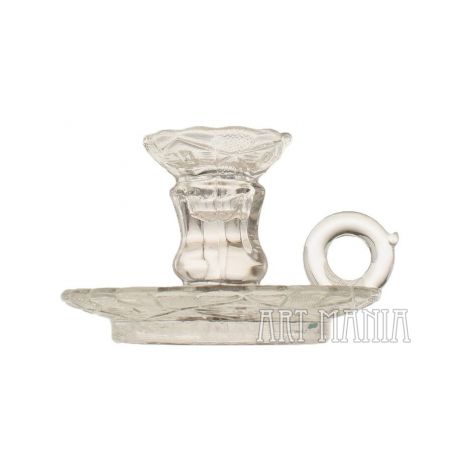 Kaganek/świecznik wykonany z bezbarwnego szkła prasowanego. Pochodzi z Huty Szkła Gospodarczego „Hortensja” w Piotrkowie Trybunalskim. W katalogu huty z 1936r. ma numer 264.