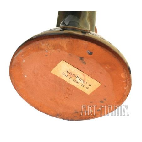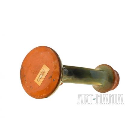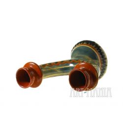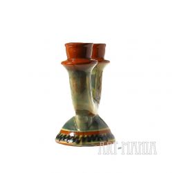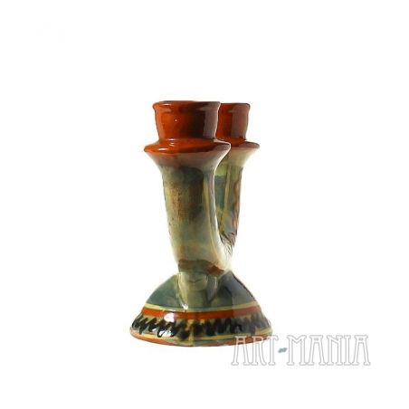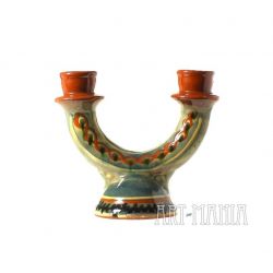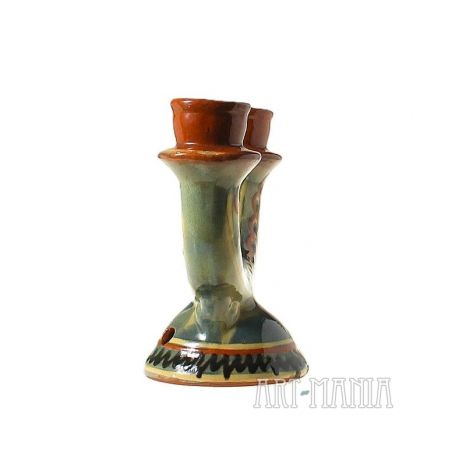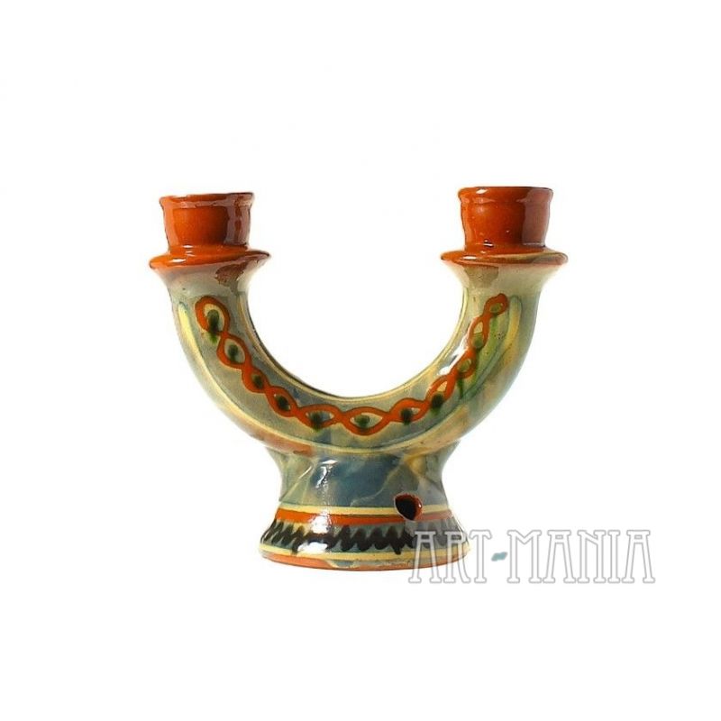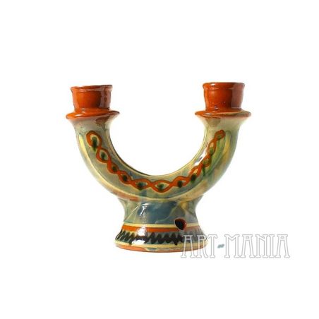 Gliniany świecznik dwuramienny. Malowany na kolor brązowy, zdobiony kolorowymi detalami, szkliwiony. Świecznik pochodzi ze Spółdzielni „Kamionka” w Łysej Górze. Lata 70XXw.
