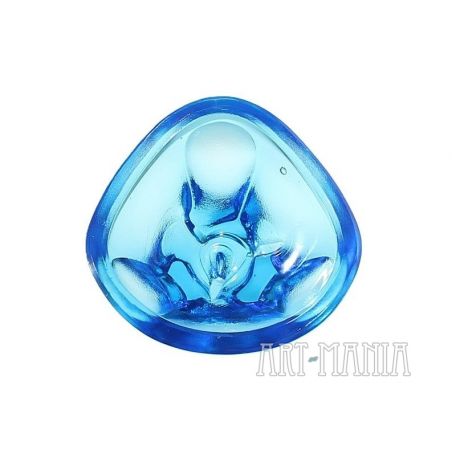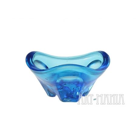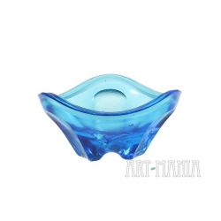 Świecznik w typie „tea light” wykonany ze szkła prasowanego barwionego w masie na kolor błękitny. Jest to przypuszczalnie projekt Vaclava Hanusa dla jednej z wytwórni zrzeszonych w Sklo Union w Czechosłowacji. Nietrudno zauważyć, że forma świecznika jest bardzo podobna do modeli popielnic projektu Jana Drosta, które seryjnie wytwarzała Huta Szkła Gospodarczego „Ząbkowice” w Dąbrowie Górniczej. Czechosłowacja, II poł. XXw.