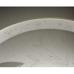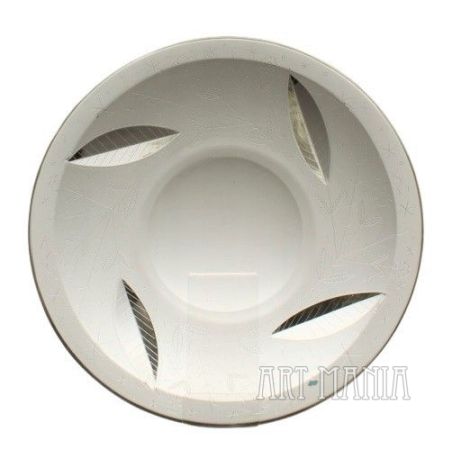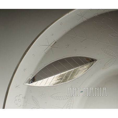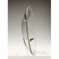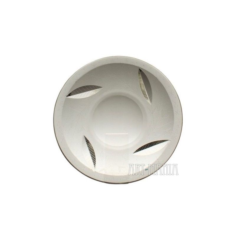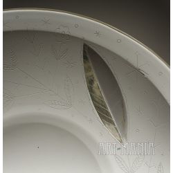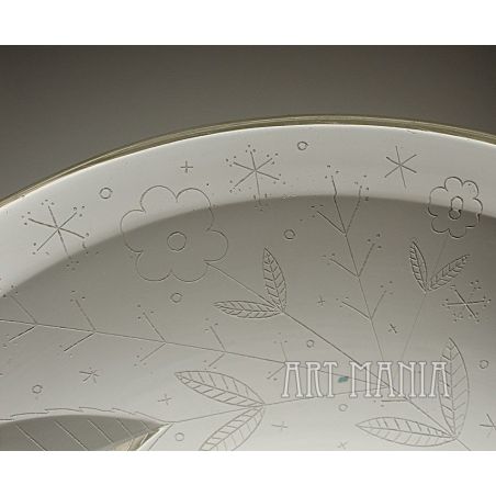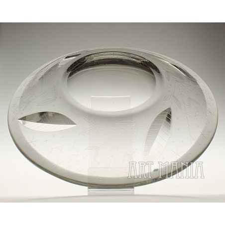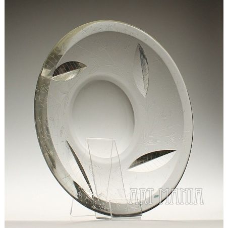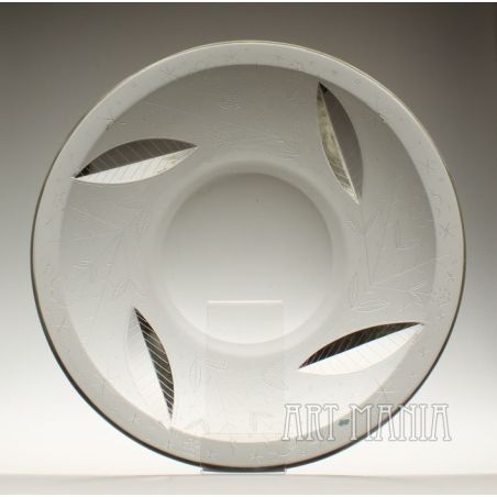 Patera na owoce wykonana z bezbarwnego szkła kryształowego. Czara zdobiona czterema tłoczonymi listkami z wyrazistym unerwieniem oraz delikatnym grawerem złożonym z kwiatów i gwiazdek. Patera pochodzi z Czechosłowacji. II poł. XXw.
