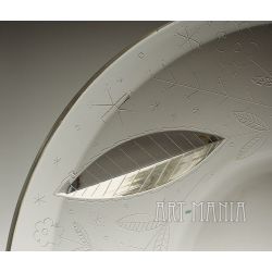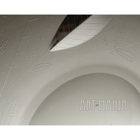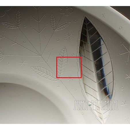 Pojedyncze rysy użytkowe wewnątrz czary. Przetarcie ok. 1cm2 od wewnątrz w pobliżu jednego z listków. Krawędź górna i krawędź podstawy bez pęknięć i odprysków. Masa szklana nie ma barwy śnieżnobiałej.