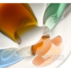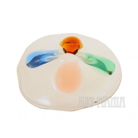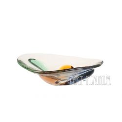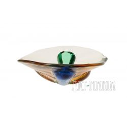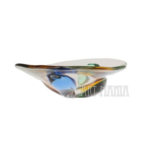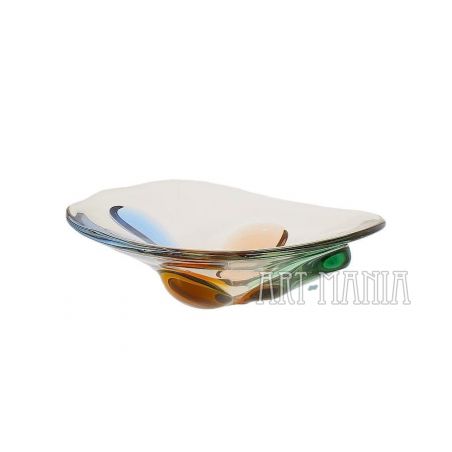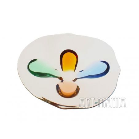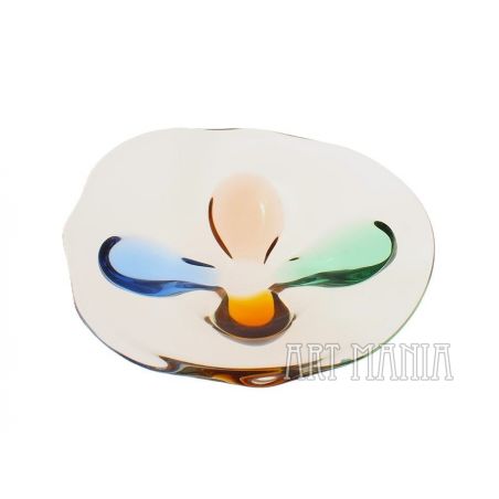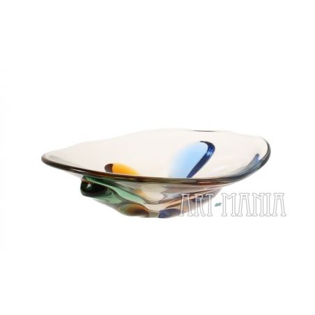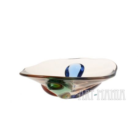 Patera na owoce wykonana ze szkła ręcznie formowanego. Czara bezbarwna z czterema wypustkami: zieloną, niebieską, miodową i łososiową. Element serii „Rapsodia”, którą w latach 50-tych zaprojektował Frantisek Zemek. Naczynie pochodzi z huty szkła Mstisov w Czechosłowacji.