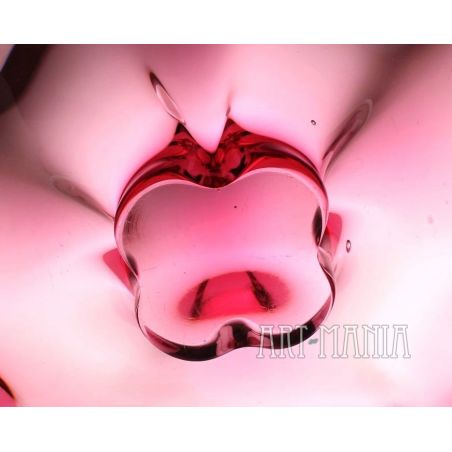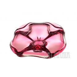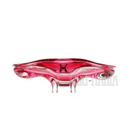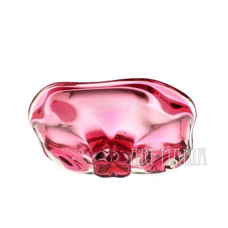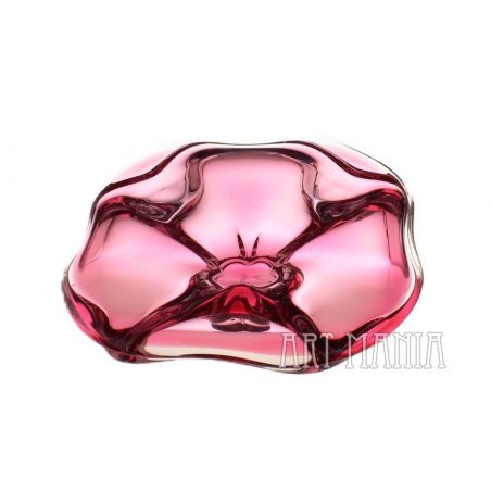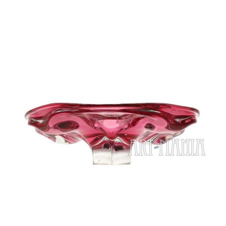 Patera na owoce wykonana ze szkła ręcznie formowanego, dwuwarstwowego: z zewnątrz bezbarwna – wnętrze różowe. Patera pochodzi przypuszczalnie z huty szkła Chribska w Czechosłowacji. Lata 70XXw.