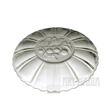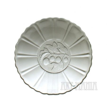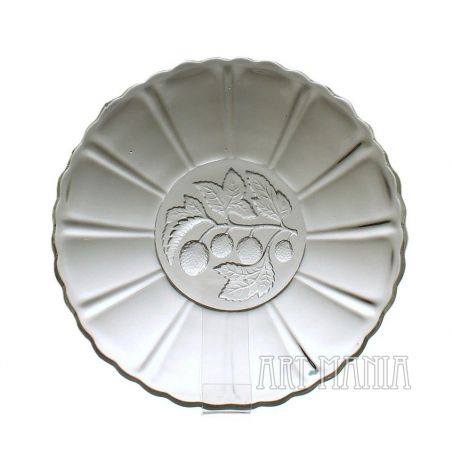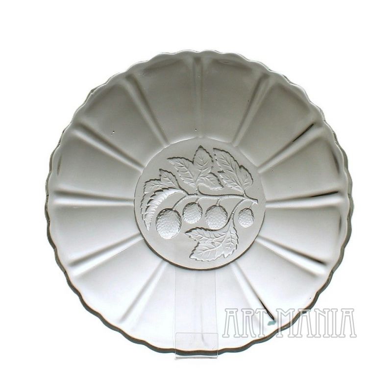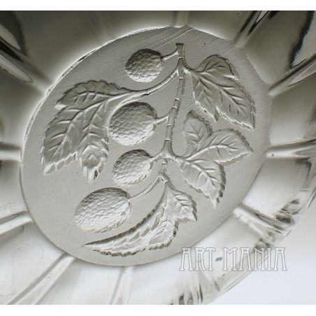 Talerz wykonany z bezbarwnego szkła prasowanego z tłoczonym motywem malin na dnie. Pochodzi z Huty Szkła Gospodarczego „Hortensja” w Piotrkowie Trybunalskim. W katalogu z 1936r. ma numer 36a.