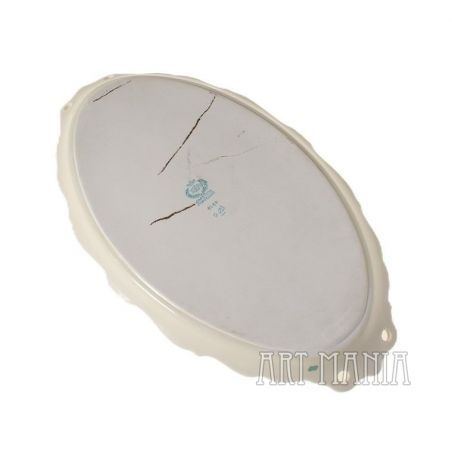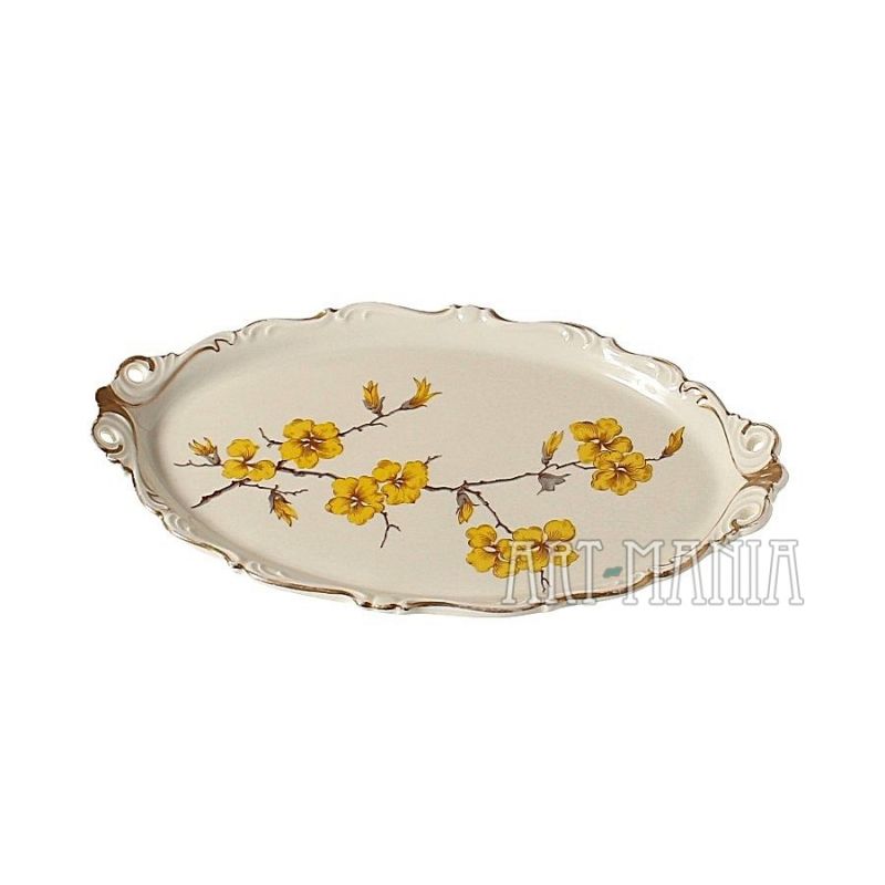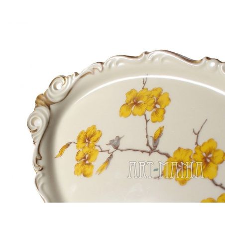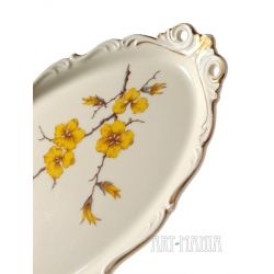 Półmisek z porcelany. Tafla i kołnierz pokryte szkliwem w kolorze ecru – spód biskwitowy. Naczynie zdobi kalkomania z żółtym motywem kwiatowym, liczne wypustki i złocenia. Naczynie pochodzi z wytwórni C. & E. Carstens Porzellanfabrik Sorau (Żary). Lata 20/40 XXw.