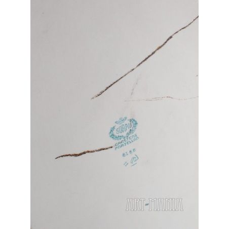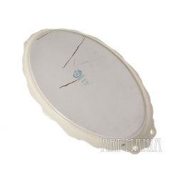 Zaledwie kilka rysek użytkowych na powierzchni płytkiej czary. Kalkomania kwiatowa bez przetarć i odprysków. W kilku miejscach przetarcia złoceń – słabo widoczne. Na jednym z owali, na czubku środkowego detalu ubytek szkliwa ok. 4mm. Na tafli podstawy czarne kreski niewiadomego pochodzenia.