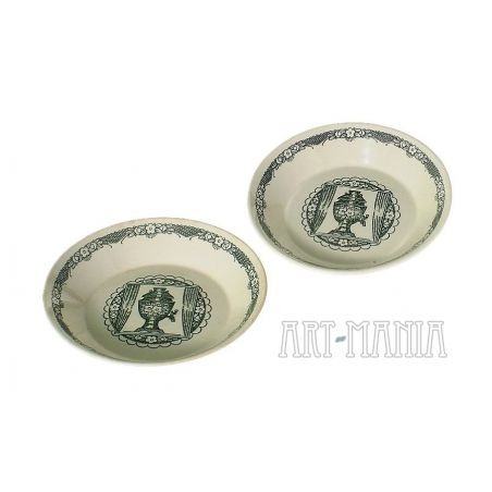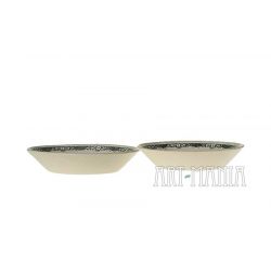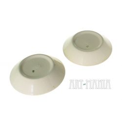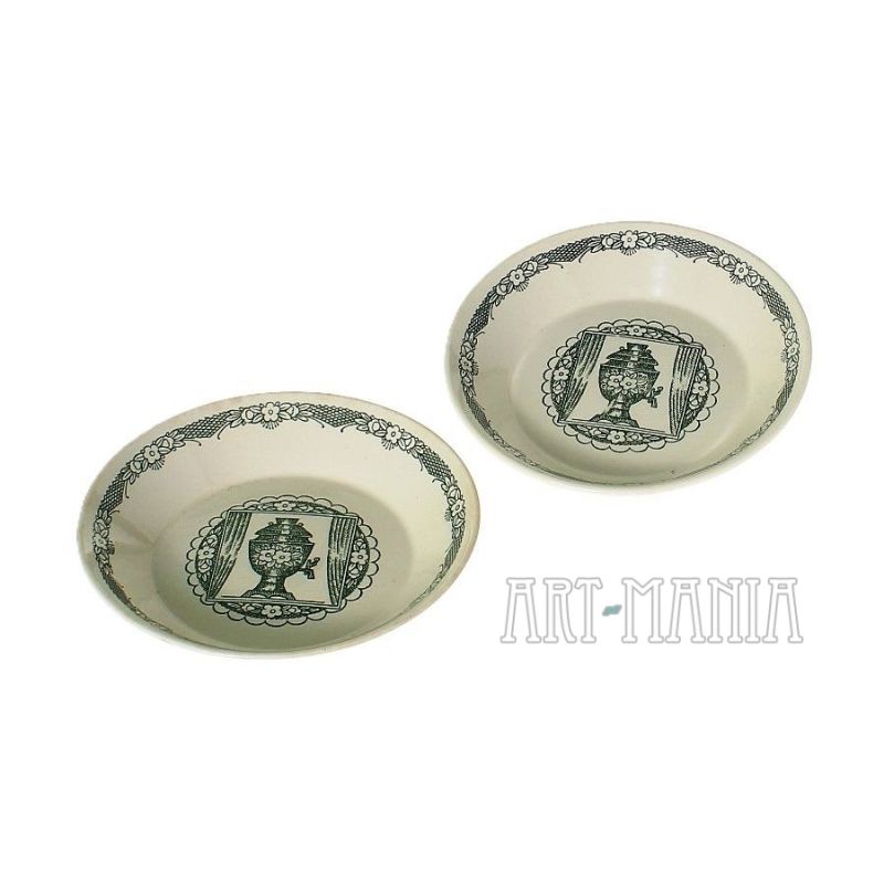 Para talerzyków z białej porcelany. Zdobione malunkami w kolorze ciemnej zieleni z motywem kwiatów i samowaru. Talerzyki pochodzą z wytwórni Koniakowo w ZSRR. Lata 70XXw.