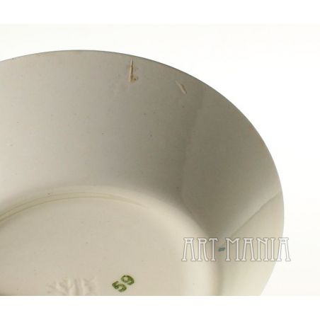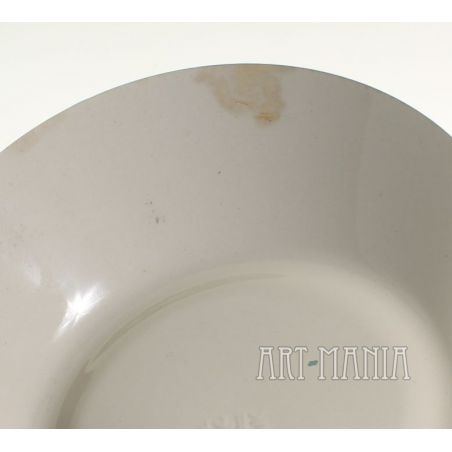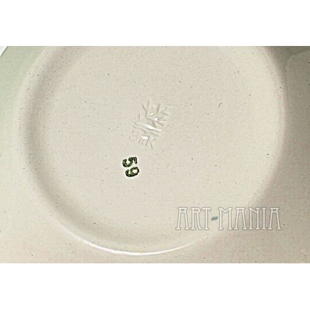 Malunki bez przetarć. Od zewnątrz przetarcie szkliwa na kołnierzu z beżowym przebarwieniem jednego z talerzyków pokazane na zdjęciach – w świetle dziennym są bledsze. Na spodzie wytłoczona sygnatura wytwórcy.