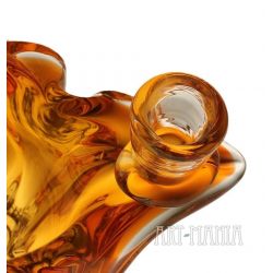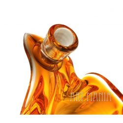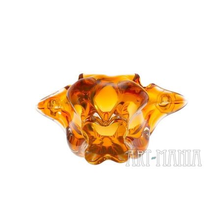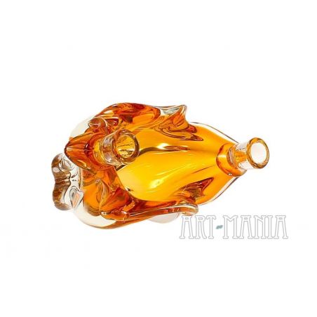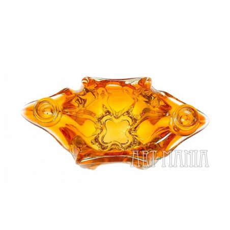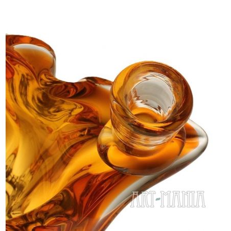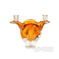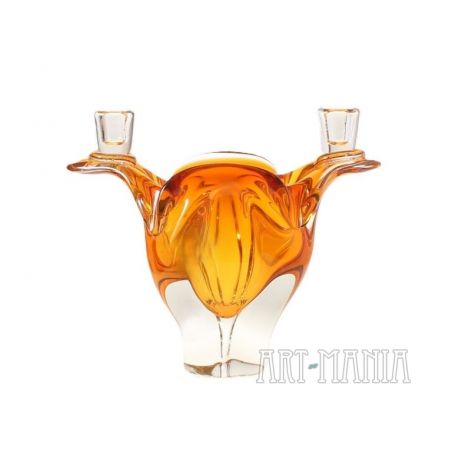 Świecznik dwuświecowy/wazon wykonany z dwuwarstwowego szkła ręcznie formowanego. Z zewnątrz bezbarwny, wnętrze barwione w masie na kolor pomarańczowy. Naczynie pochodzi z huty szkła Chribska w Czechosłowacji. Numer katalogowy 296/7/21. Lata 70XXw. Model bardzo rzadko spotykany.