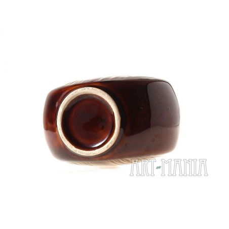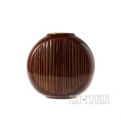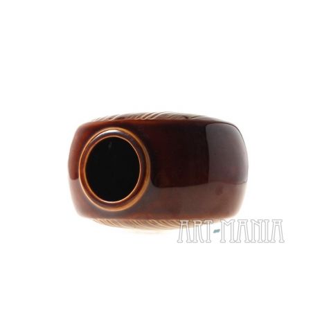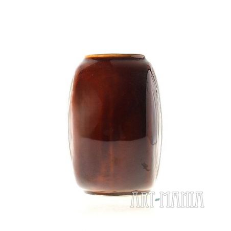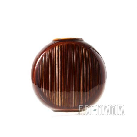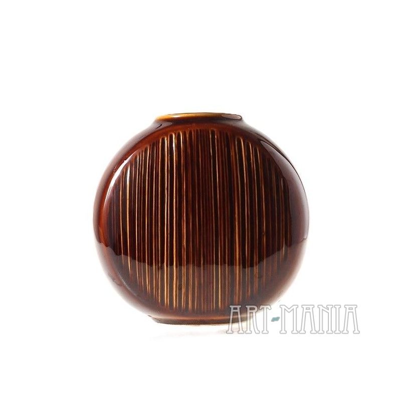 Okrągły wazon z porcelitu. Zdobiony brązowym szkliwem. Pochodzi z Zakładów Porcelitu Stołowego „Pruszków” w Pruszkowie. Lata 70XX w.