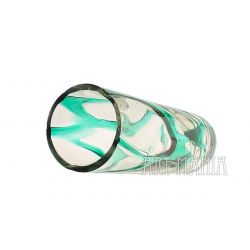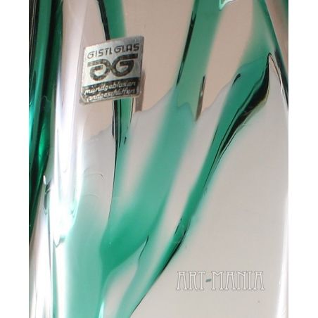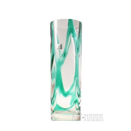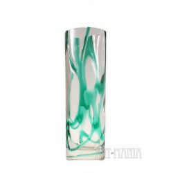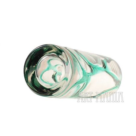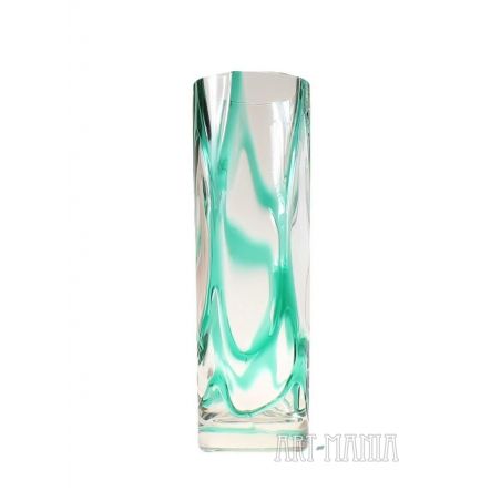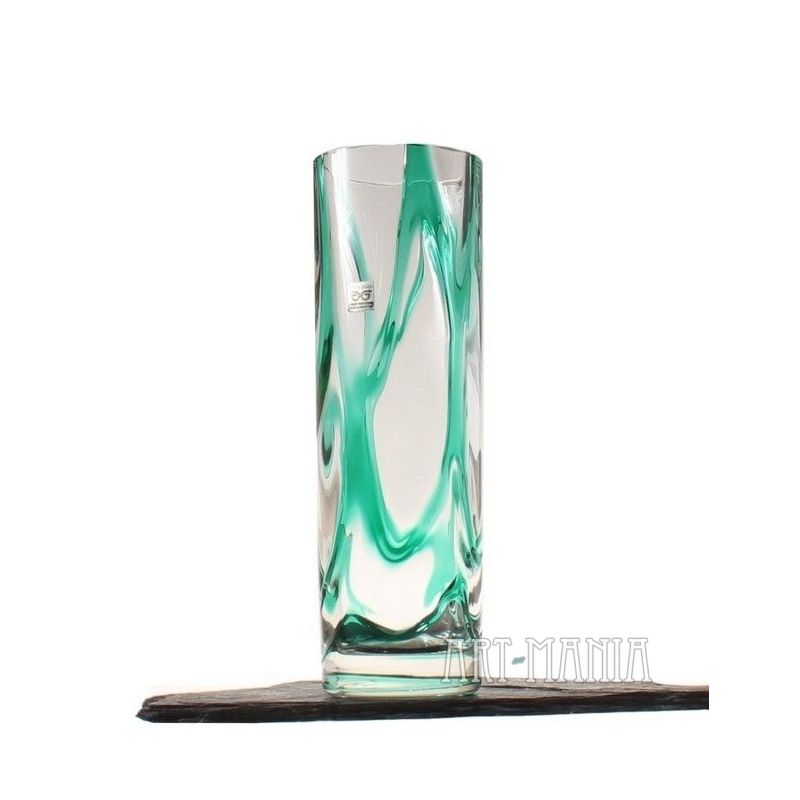 Wazon tuba. Brzusiec bezbarwny zdobiony od zewnątrz zaciekami zielonej masy szklanej. Wazon pochodzi z niemieckiej wytwórni Mundgeblasen. Lata 70XXw.