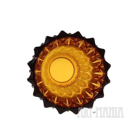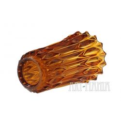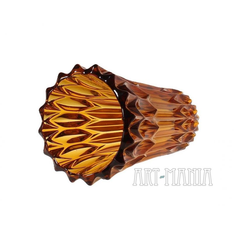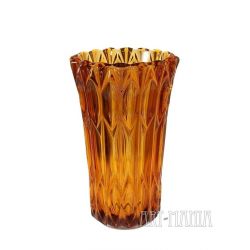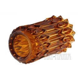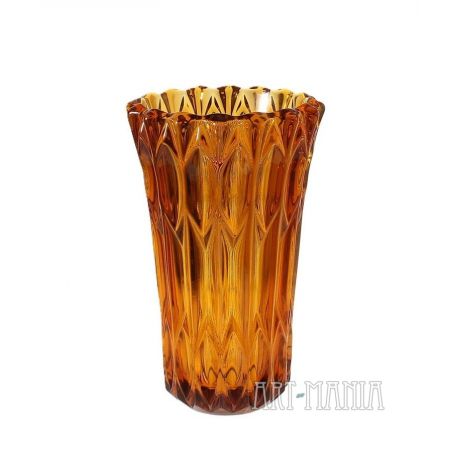 Wazon wykonany ze szkła prasowanego barwionego w masie na kolor miodowy. Brzusiec zdobiony geometrycznym reliefem. Pochodzi z Czech z okresu powojennego.