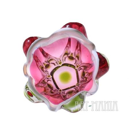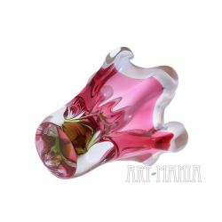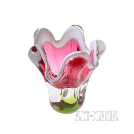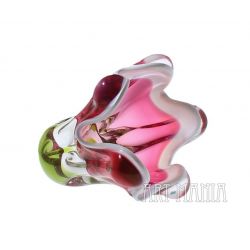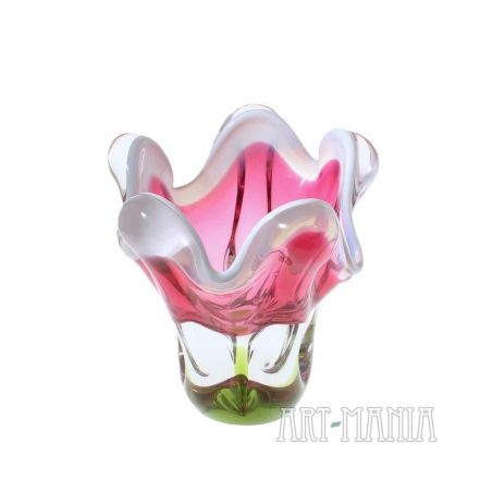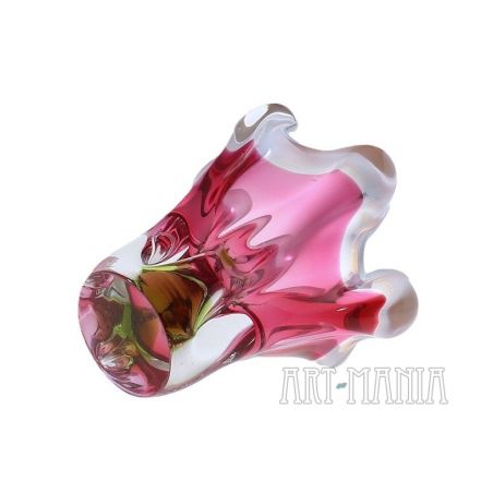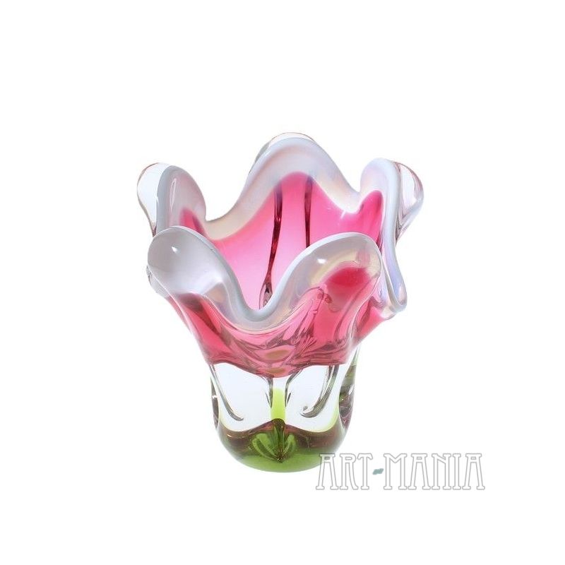 Wazon wykonany ze szkła ręcznie formowanego, barwionego w masie na kolor mleczny, różowy i zielony. Brzusiec bezbarwny z różowym wnętrzem, trzon podstawy jasnozielony. Wypustki na krawędzi wlewu zdobi mlecznobiała obwódka. Wazon zaprojektował Josef Hospodka dla huty szkła Chribska. Numer katalogowy 316/4/16. Czechosłowacja, lata 70XXw.