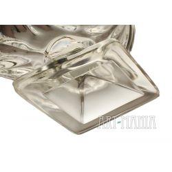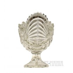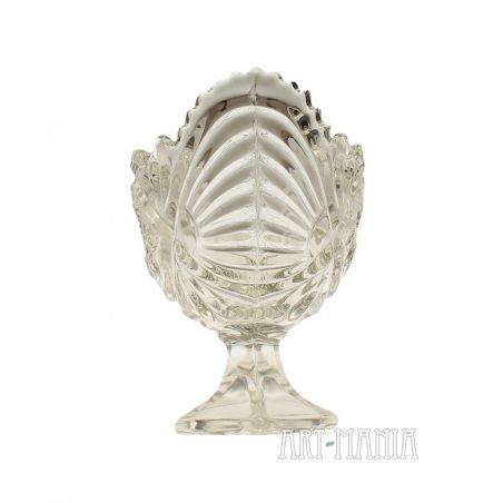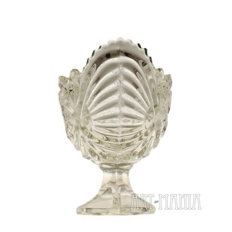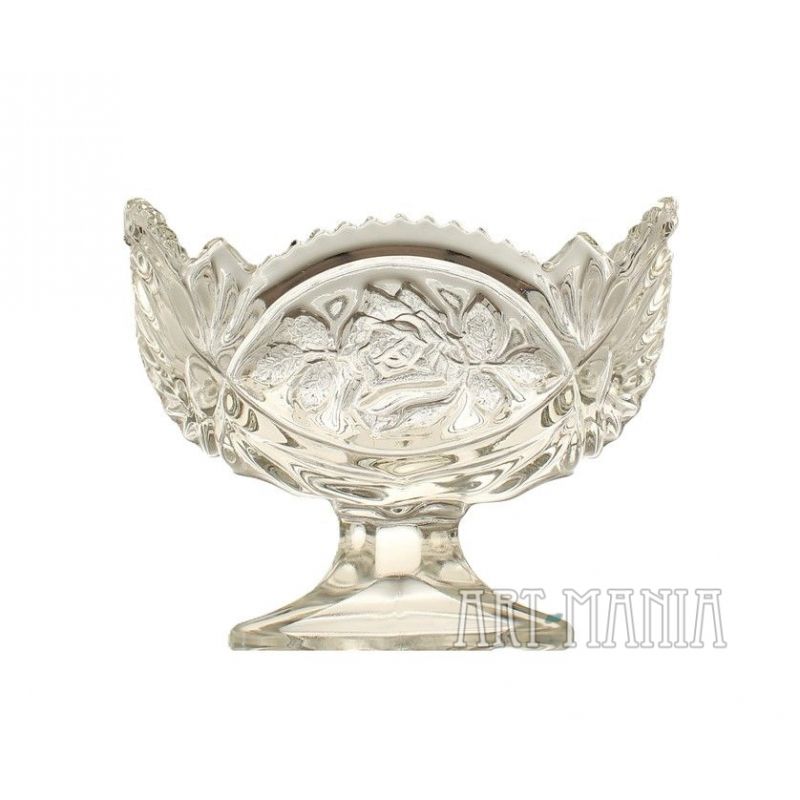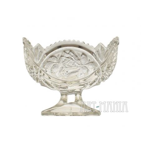 Żardiniera na stopie wykonana z bezbarwnego szkła prasowanego – model zamknięty. Czara zdobiona tłoczonym motywem róży, podstawa w kształcie rombu, brzeg czary ząbkowany. Żardiniera pochodzi z Huty Szkła Gospodarczego „Ząbkowice” w Dąbrowie Górniczej. W katalogu Minexu naczynie ma numer 292. Lata 70/80XXw.