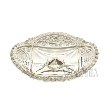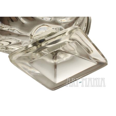 Krótka, przerywana wada włosowata na spodzie czary. Brak rys użytkowych. Ząbki na krawędzi czary bez odprysków. Na jednym z rogów podstawy płaski odprysk ok. 4mm. Tłoczenie wzoru wyraźne.